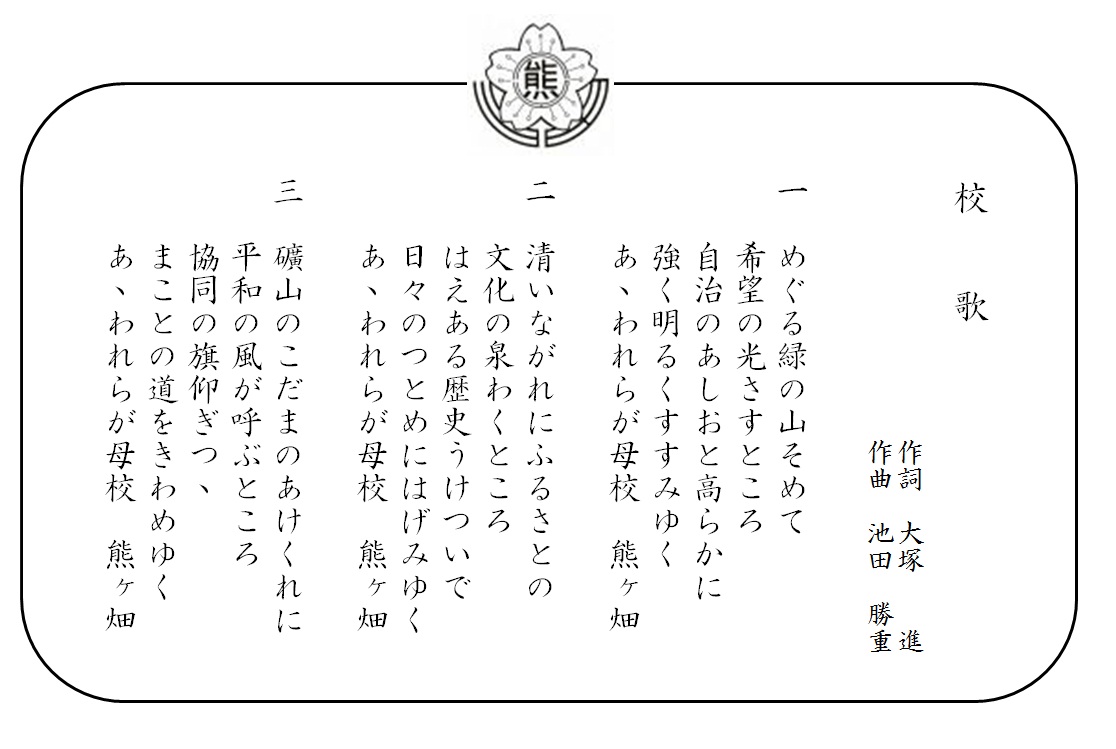 熊ヶ畑尋常小学校として独立 上山田尋常小学校の分教場 4月1日独立 山田町立熊ヶ畑小学校 市制施行により山田市立熊ヶ畑小学校校章・校旗・校歌制定 現校舎に移転 嘉飯山小規模校研究発表会 学校裏山に新運動場起工・工事完成 講堂完成 講堂・運動場落成式 創立20周年記念岩石園完成 県展10周年連続学校賞に付市教委表彰 創立75周年記念式典 日本PTA全国協議会より表彰「地域に結びついた学校教育」 交通安全実践活動努力賞受賞 歌志内市・山田市小学校児童交流開始 山田市運動公園完成(熊ヶ畑小運動場) 全国学校給食会で文部大臣賞受賞 植樹(運動公園裏門側) 市教育委員会指定・委嘱研究発表会 県発明工夫展に於いて「学校賞」受賞 トイレ全面改修工事 階段全面改修工事 シャワー室設置 市教育委員会指定・委嘱研究発表会 校地移転50周年記念式典 ありがとう山田市立熊ヶ畑小学校 合併により嘉麻市立熊ヶ畑小学校 熊っ子緑化事業植樹祭式典 市教育委員会指定・委嘱研究発表会 市学校給食会研究発表会 第61回福岡県植樹祭 福岡県植樹祭実行委員長賞受賞 青少年赤十字活動県大会 「金の枠表彰」(10年継続)受賞 運動場体育倉庫プレハブ新築 創立100周年記念式典 |